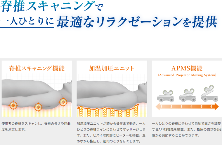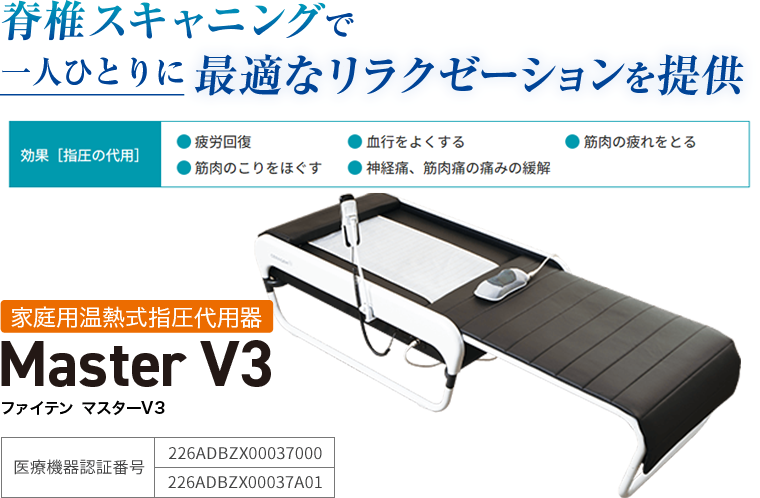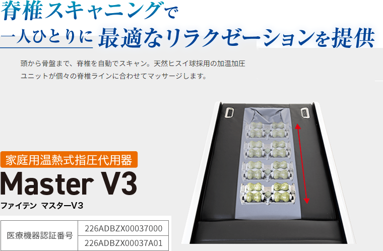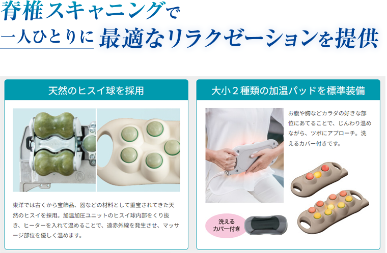 | ファイテン マスターV3(自動温熱式指圧代用マシン) 美容室 髪屋ではファイテン マスターV3(自動温熱式指圧代用マシン)を導入しています。脊椎を自動でスキャンし、天然のヒスイ球を用いた加温加圧ユニットが、個々の脊椎ラインに合わせてマッサージを行います。このシステムは、体調に合わせて選べる6段階の強さと12種類のモードを備え、光テクノロジー「健光浴®」と音楽の癒し効果を組み合わせることで、究極のリラクゼーションを提供します。世界76ヶ国で300万人以上が体験したこの技術で、至福の時間をお楽しみください。 |